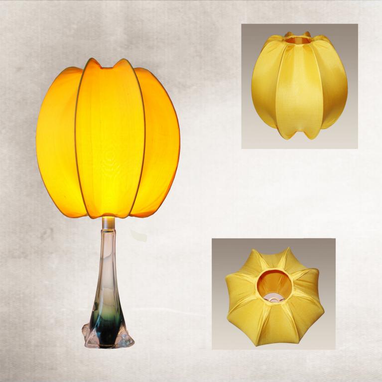 Abat-jour "pagode trompette" pour lampe client, tendu en soie jaune, doublure écru, bordage des arêtes tissu identique.