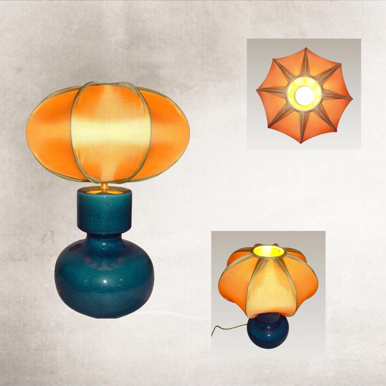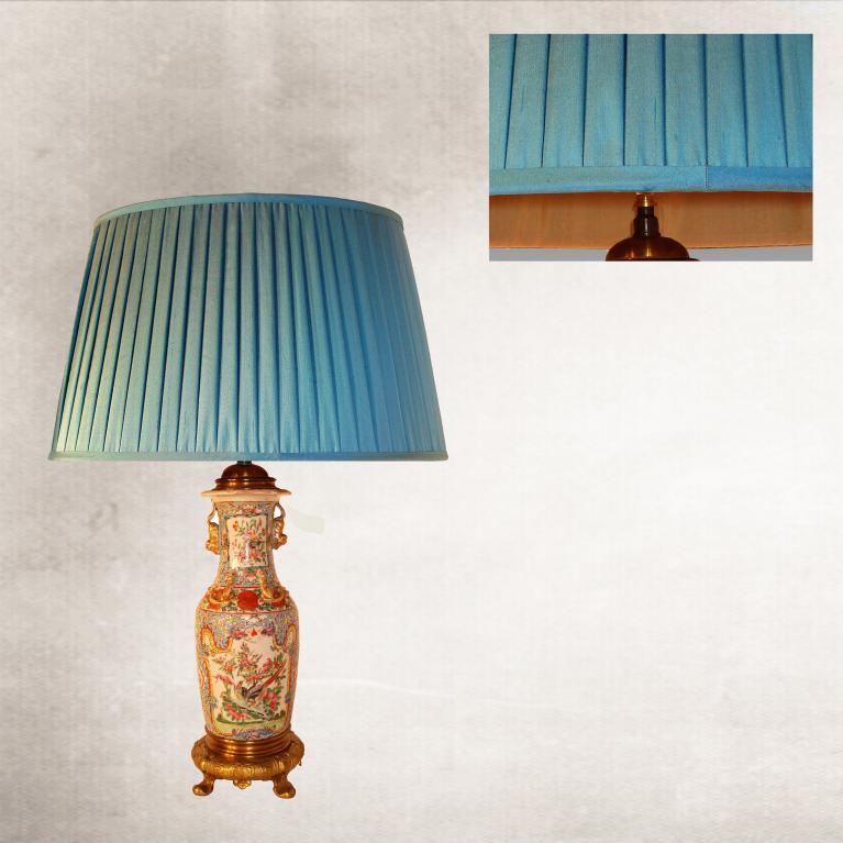 Abat-jour oval pour lampe vase client, plissé fin soie bleue, doublure dorée.