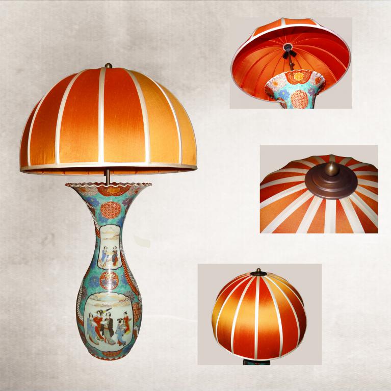 Abat-jour 60 cm "dôme" pour lampe client, tendu en soie sauvage orange, doublure tissu identique, bordage des arêtes en soie blanche.
