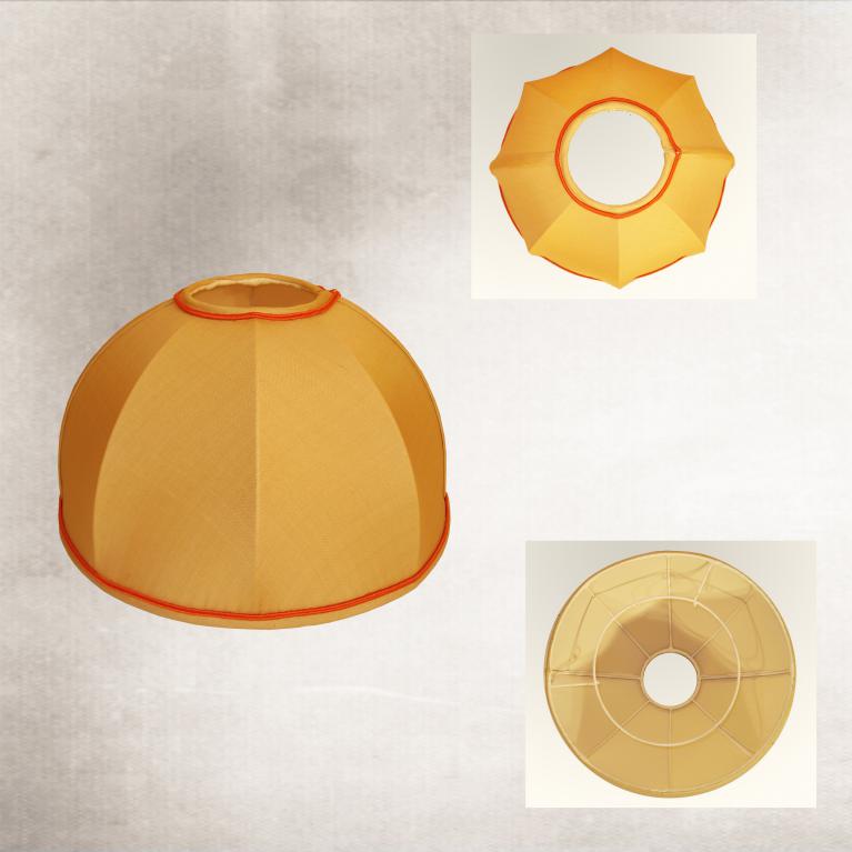 Abat-jour "dôme" pour lampe client, tendu en soie sauvage orange, doublure tissu identique, bordage des arêtes en soie blanche.