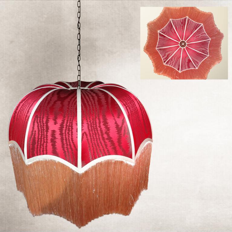 Abat-jour 85 cm suspension "dôme parapluie" , tendu tissu client, passementerie franges, bordage des arêtes avec galon en gros lin.