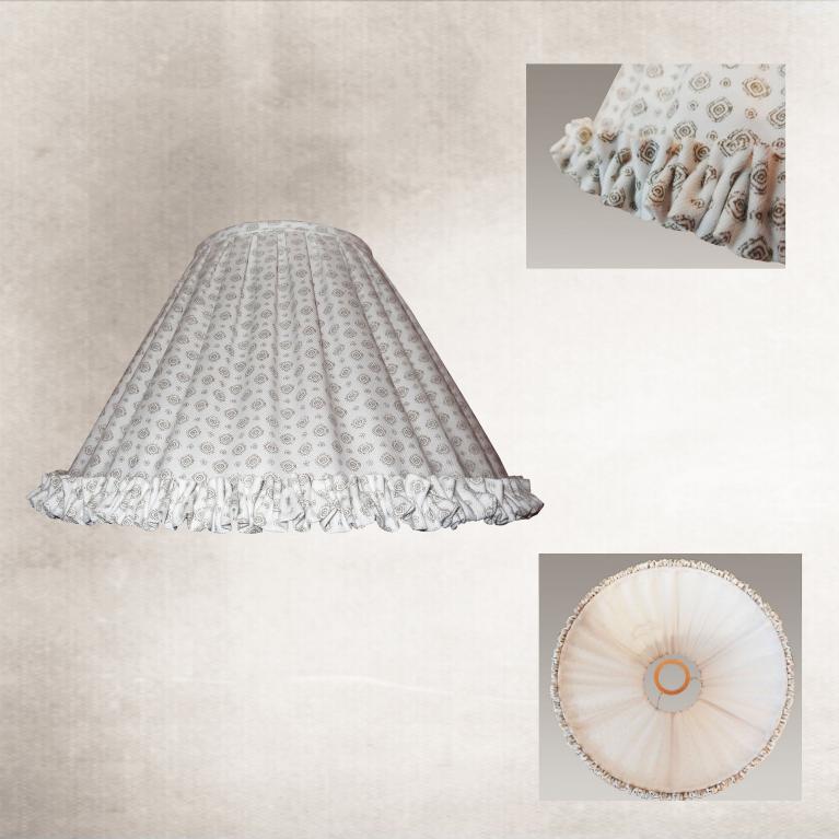 Abat-jour "conique" froncé avec tissu client, doublure blanc cassé, froufrou bas dans le même tissu.