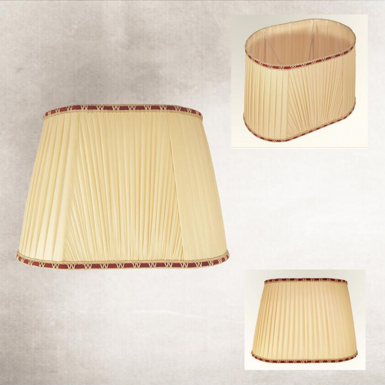 Abat-jour "droit oval" pour pied de lampe client, plissé fin soie écru avec éventail froncé sur le devant, doublure blanc cassé, galons client haut et bas.