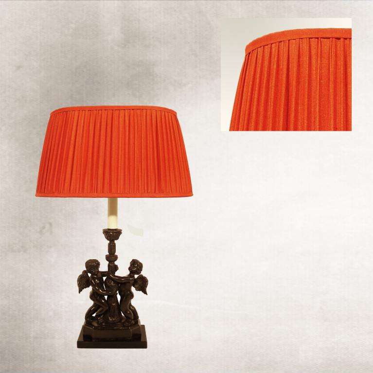 Abat-jour oval pour pied de lampe client, froncé soie rouge, doublure blanc cassé.
