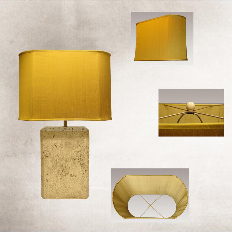 Abat-jour "oblong" pour lampe client, tendu en soie jaune, doublure tissu identique.