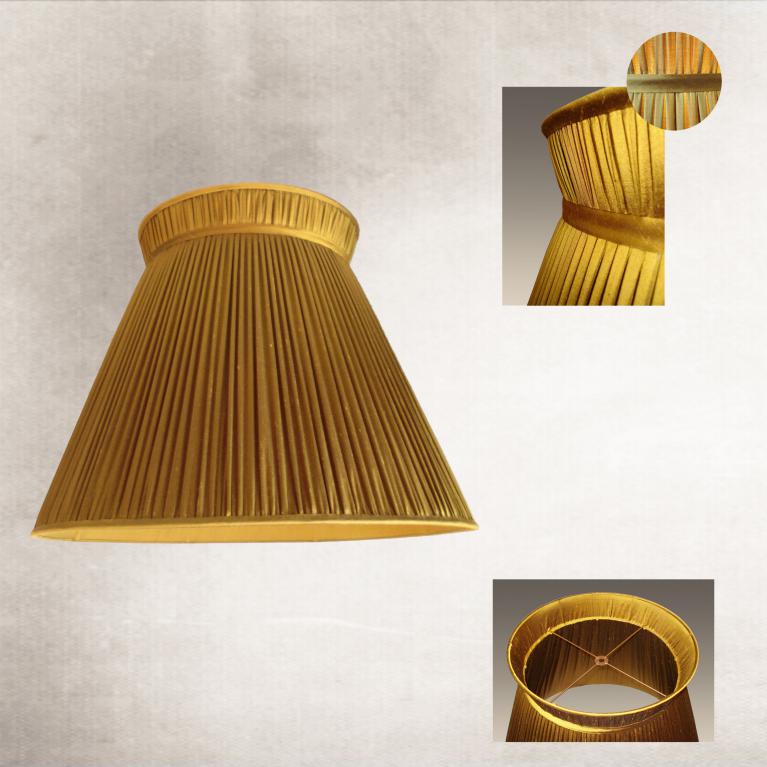 Abat-jour "conique avec bandeau" pour pied de lampe client, froncé en soie dorée, doublure identique, bordage des arêtes en soie jaune.