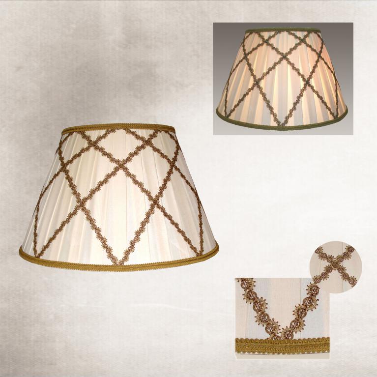 Abat-jour 55 cm droit pour lampe client, plissé soie naturelle, doublure blanc cassé, ornement en superposition croisillons de galons.