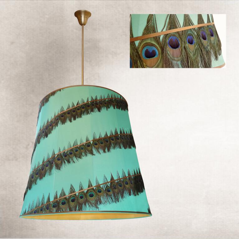 Abat-jour 75 cm suspension "droit", tendu en soie turquoise, doublure en soie dorée, ornement galon de plumes de paon en spirale.