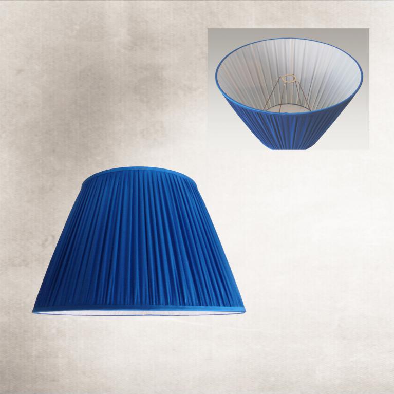 Abat-jour droit froncé en soie bleu, doublure de soie blanche.