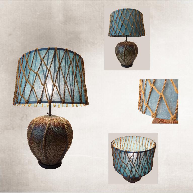 Abat-jour "droit" pour lampe client, tendu voile de lin bleu, doublure tissu identique, ornement grosse laine tressage effet "filet de pêche".