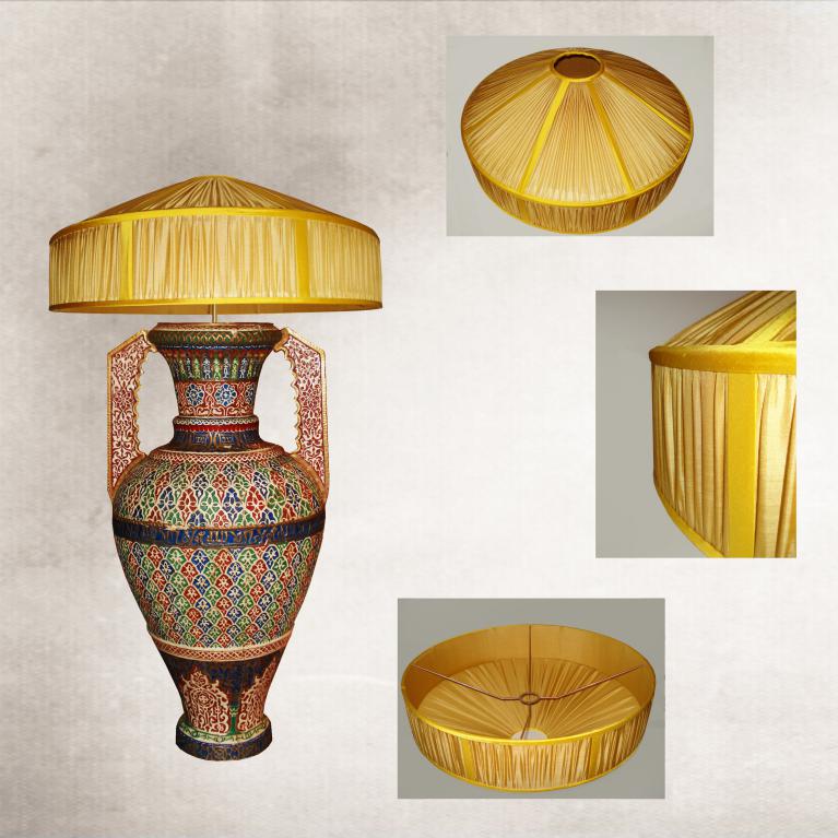 Abat-jour 38 cm"double conique à col" pour lampe client , plissé soie sauvage, doublure dorée, passementerie et galons client.