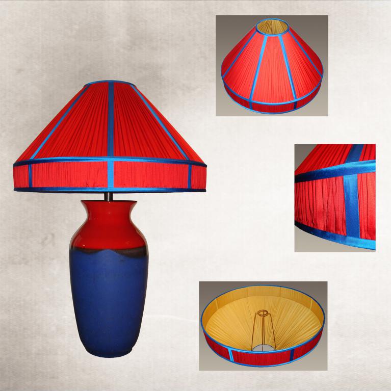 Abat-jour "conique avec bandeau" pour pied de lampe client, froncé en soie rouge, doublure identique, bordage des arêtes en soie bleue.