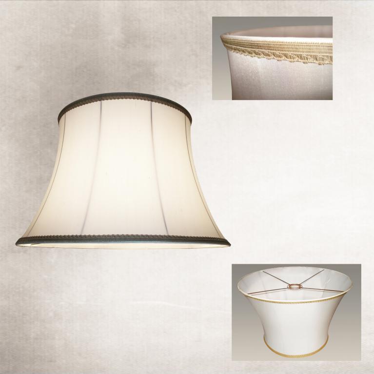 Abat-jour 40 cm "pagode" pour lampe client, tendu soie blanche, doublure blanche, galons à l'ancienne.