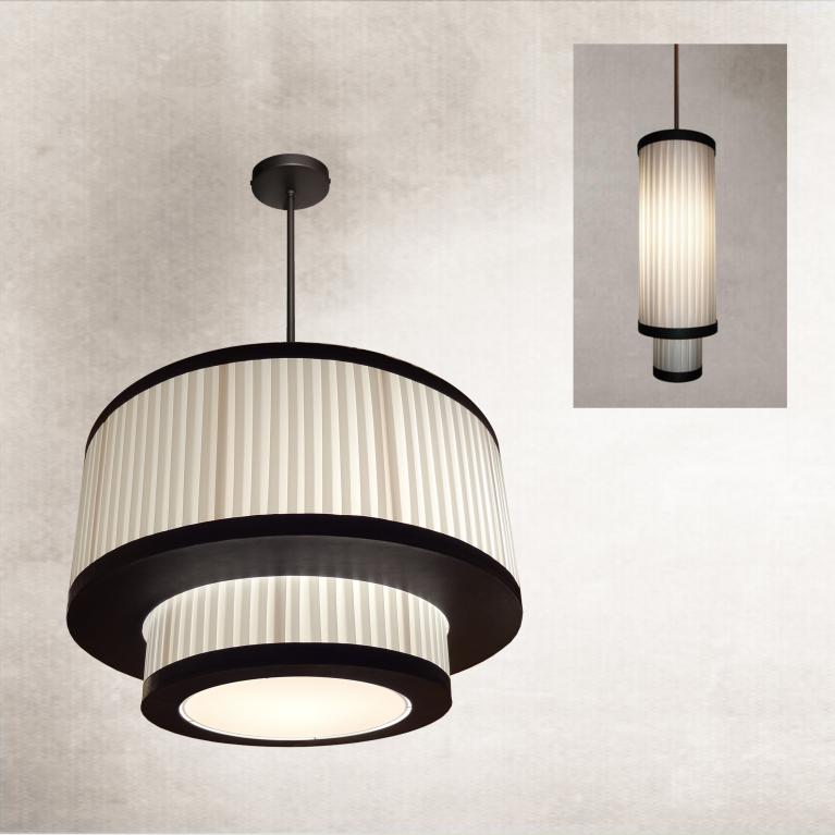 Abat-jour suspension "double cylindre bandeau", plissé fin doublure de soie blanche, bordage et diffuseurs partiels en cuir noir.