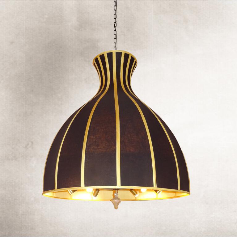 Abat-jour suspension "tulipe", tendu en lin noir lin, doublure en soie dorée, bordage des arêtes en soie dorée.