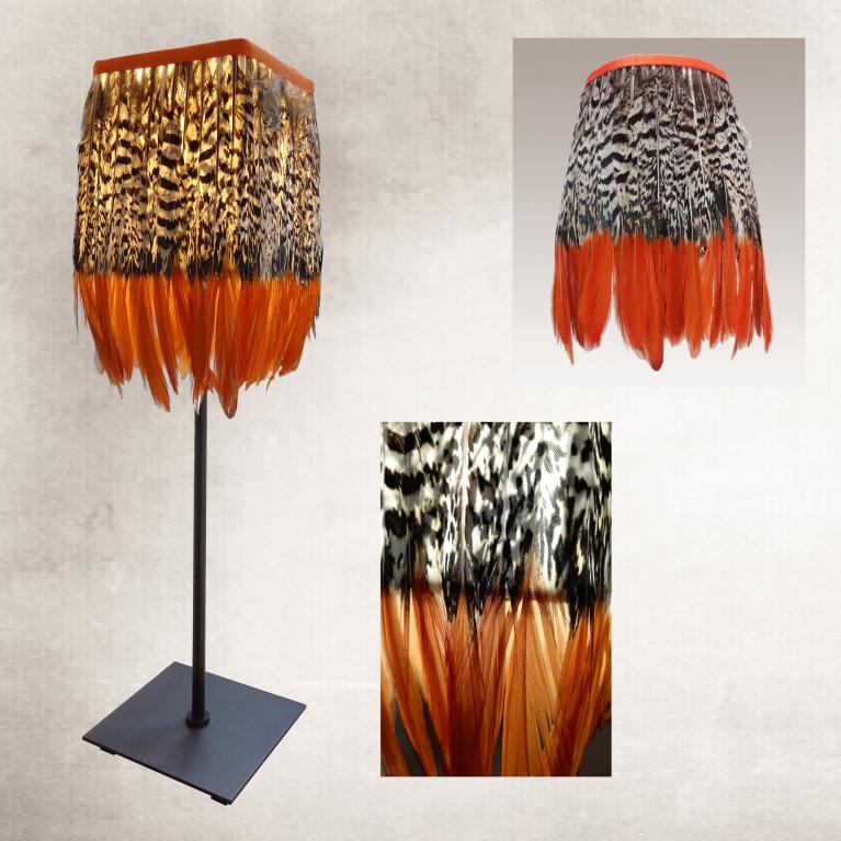 Abat-jour carré et rond 20 cm, tendu tissu blanc doublure identique avec ornement plumes client,